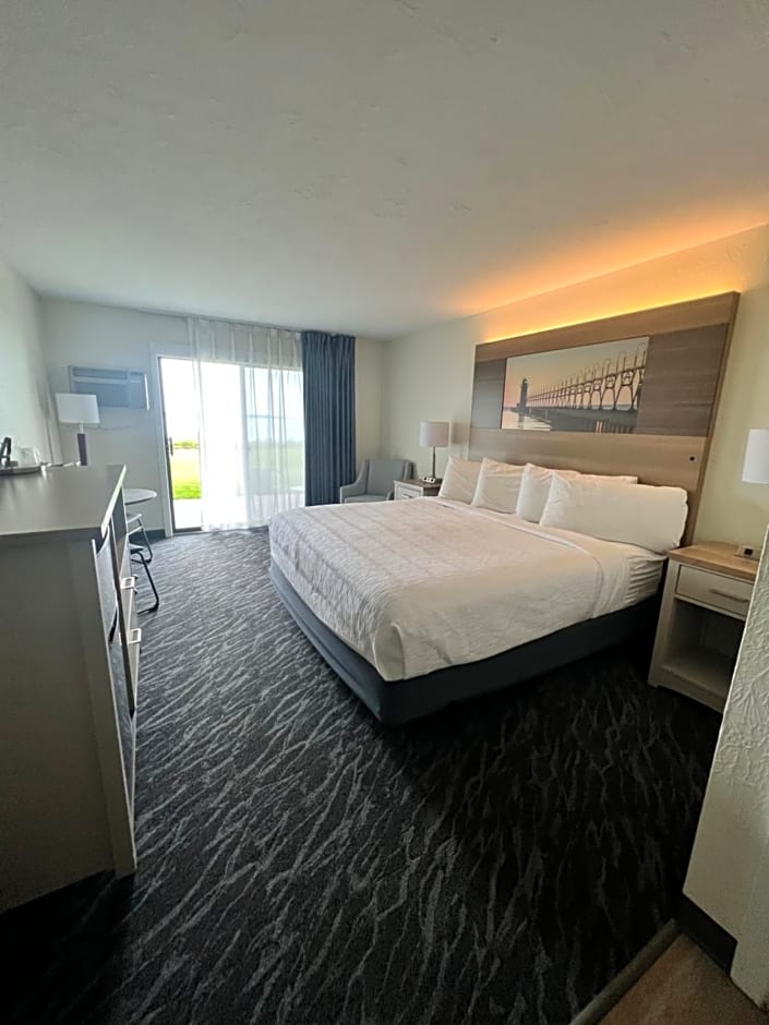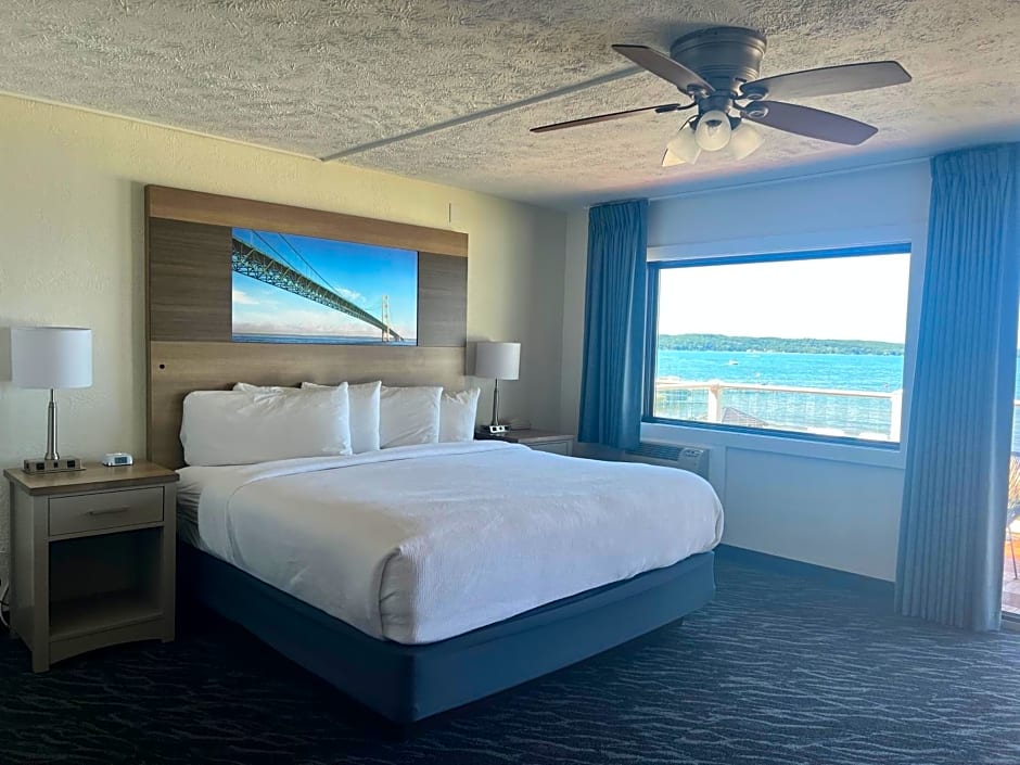 This double room features a seating area, and sofa. It features a direct walk out to East Grand Traverse Bay.
